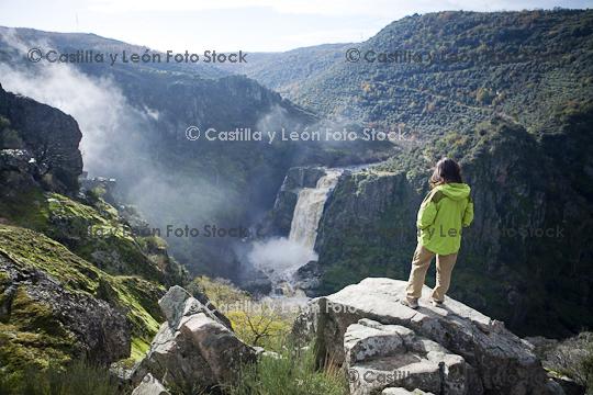 Descripción:  Excursionista junto a la cascada del Pozo de los Humos, Parque Natural de los Arribes del Duero, Salamanca