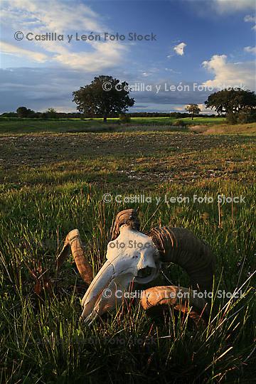 Referencia: 22003 Descripción: Cráneo de carnero en una dehesa de La Orbada, Castilla y León; Salamanca. España Palabras clave: Provincia Patrimonio natural Naturaleza Paisaje Fauna Oveja Ovis aries Ganadería Ganado Huesos Cuernos Encina Quercus Ilex |